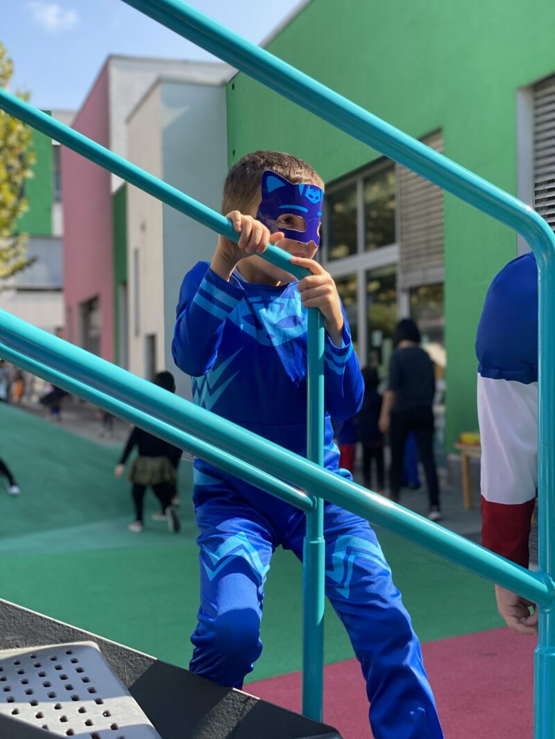all the kindergarten students celebrated Halloween as well. Beautifully costumed, they went from class to class to participate in different workshops with each of the teachers. The students had the opportunity to work on the Halloween theme in language, art and motor skills: haunted house collage and scary story, spider making in volume, puppet theater with a witch story, round ghosts and skeleton dancing, and finally a sporting course in the dark with a lot of cobwebs… A very special morning which all the children liked.