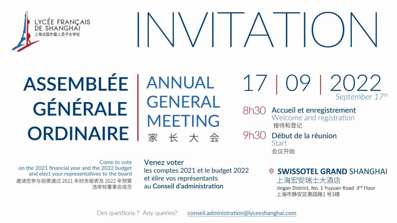 The Board of Directors and the Parents’ Association of Shanghai French School invite the LFS families to participate in the Annual General Meeting of the active members, on Saturday, September 17 at 9:30am at the Swissotel Grand Shanghai.
