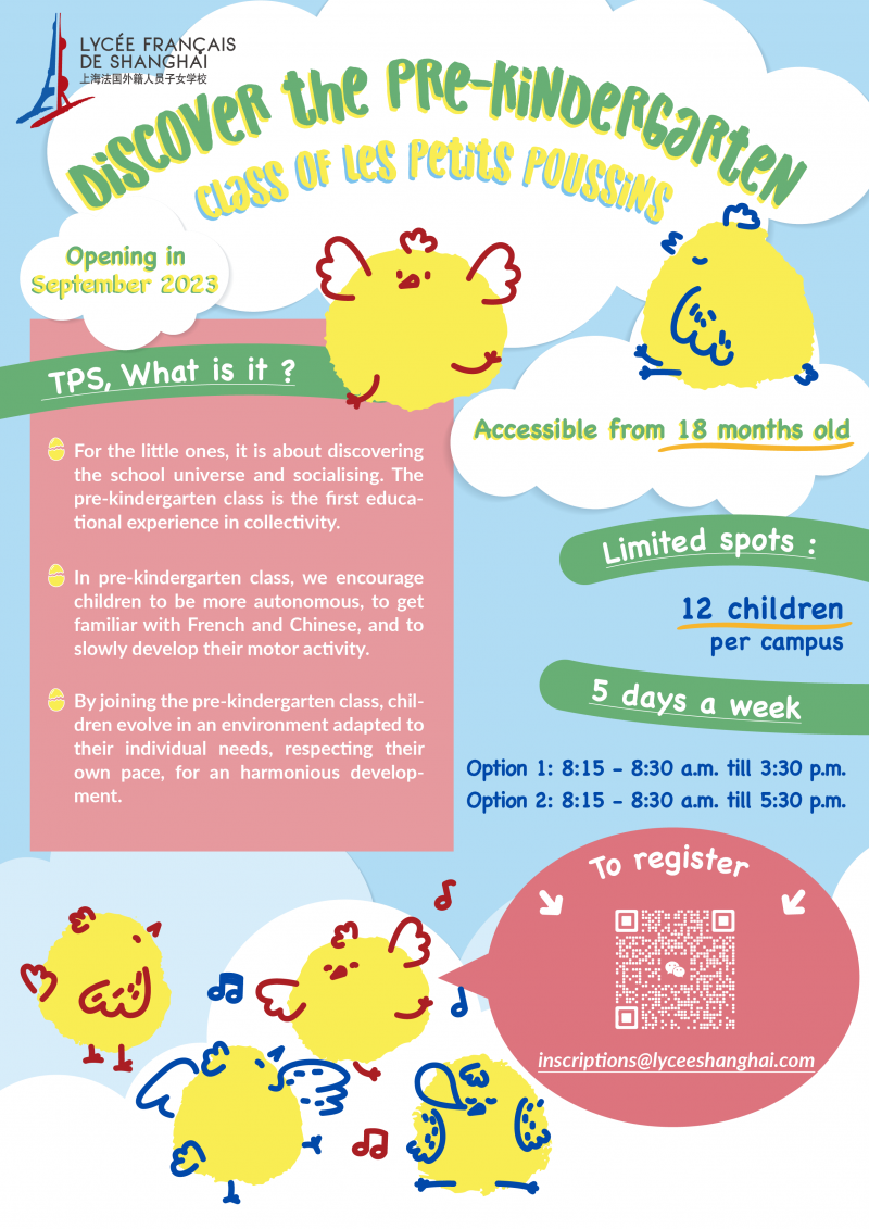 We are thrilled to announce the upcoming opening of the Toute Petite Section (pre-kindergarten class) of the LFS “Les Petits Poussins” on our Qingpu and Yangpu campuses, starting from the back-to-school 2023-2024!