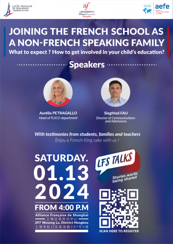 Venez rencontrer nos spécialistes du programme « Français, langue de scolarisation » (FLSco) du LFS ainsi que nos élèves, parents et enseignants pour en comprendre les spécificités et les enjeux lors d’un événement qui se tiendra à l’Alliance Française de Shanghai le samedi 13 janvier 2024 à 16h. Top of Form