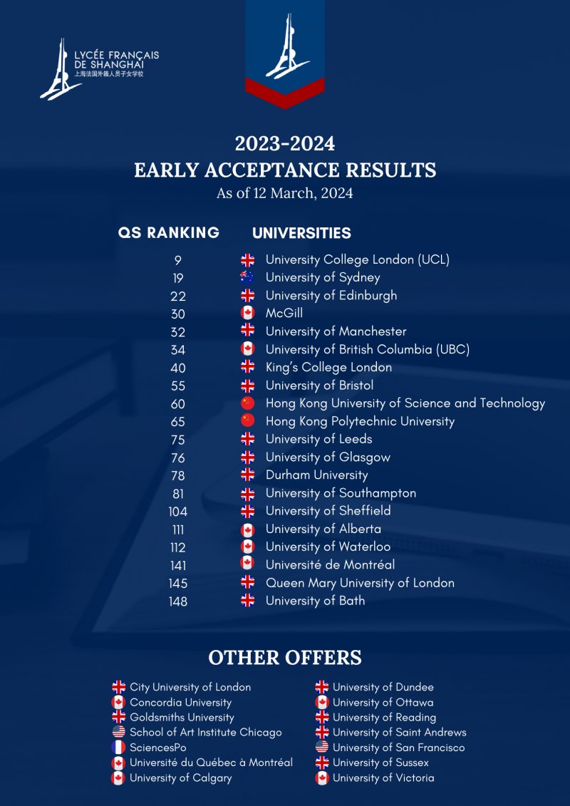 Le Lycée Français de Shanghai est fier de partager les résultats préliminaires d’admission anticipée de ses brillants élèves. Alors que les universités anglophones communiquent les résultats d’admission progressivement jusqu’à la fin avril, nous avons déjà une première indication des succès de nos élèves ! Et quel succès !