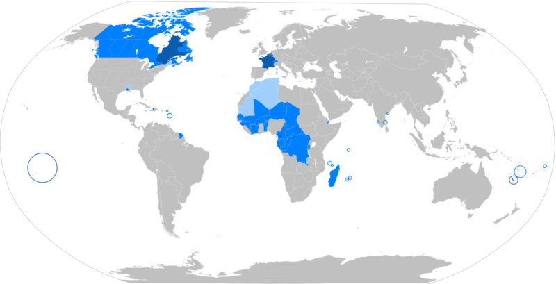 Francophonie Map 2025 (Dark Blue – Native and official majority language, Light Blue – Official language, not native, Pale Blue – Language of culture or administration de facto, without official status)